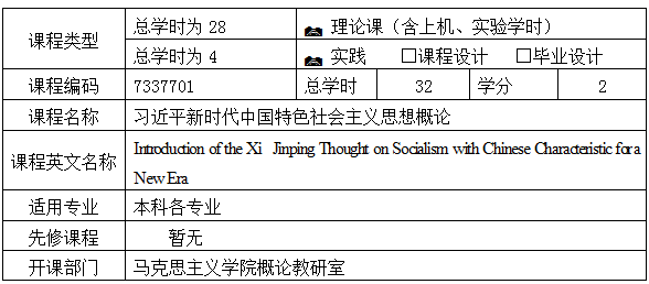 教学内容:(1)习近平新时代中国特色社会主义思想的形成条件。(2)习近平新时代中国特色社会主义思想的核心要义和主要内容。(3)习近平新时代中国特色社会主义思想的历史地位