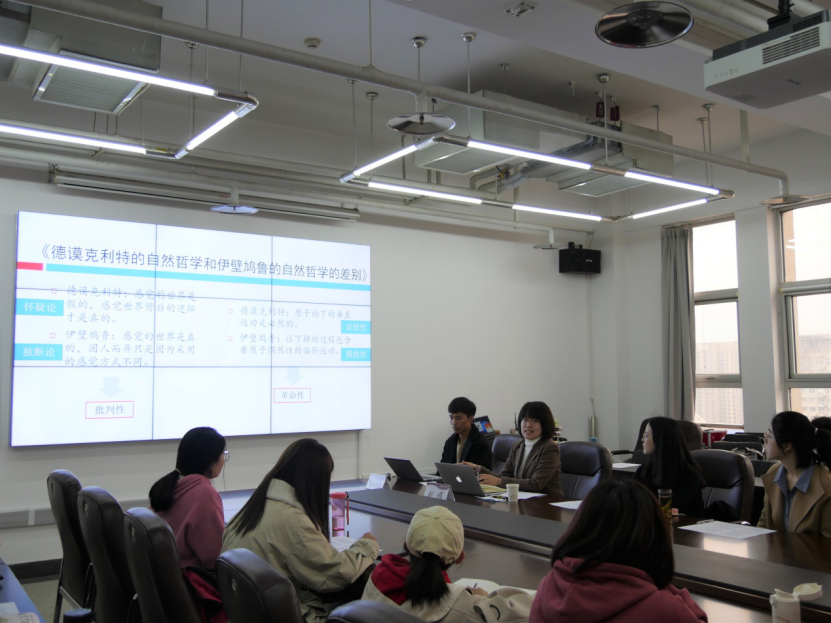 读书会以“真学、真懂、真信、真用、真教”为宗旨,以阅读马克思主义经典原著为方向,采取句读研讨、师生互动、专家讲解等丰富形式,坚持打造英国beat365官方网站学术共同体。以教师推荐读本、学生自荐领读、师生共同研读的形式,本学期经典读书会共策划开展八期经典阅读活动,书目涉及哲学、文学、历史学、社会学等多个领域。本期读书会围绕马克思的博士论文《德谟克利特的自然哲学和伊壁鸠鲁的自然哲学的差别》进行阅读讨论,共分为“学生领读、教师解读、交流提问”三个环节。