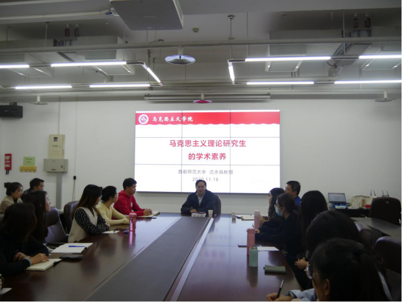 11月18日下午,beat365官网特邀首都师范大学英国beat365官方网站副院长、北京高校中国特色社会主义理论研究协同创新中心(首都师范大学)常务副主任、北京市伦理学会副秘书长、首都师范大学社会文化史研究中心研究员、北京市委讲师团宣讲专家沈永福教授,在瀚学楼1208会议室主讲题为《马克思主义理论研究生的学术素养》的学术报告,beat365官网全体研究生到场聆听,报告由beat365官网副院长张茂林主持。