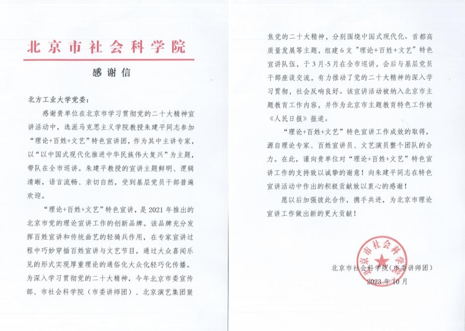 近日,北京市社会科学院(市委讲师团)给我校发来感谢信,感谢我校对北京市学习贯彻党的二十大精神宣讲活动的大力支持,对beat365官网朱建平教授在“理论+百姓+文艺”特色宣讲中表现给予充分肯定。