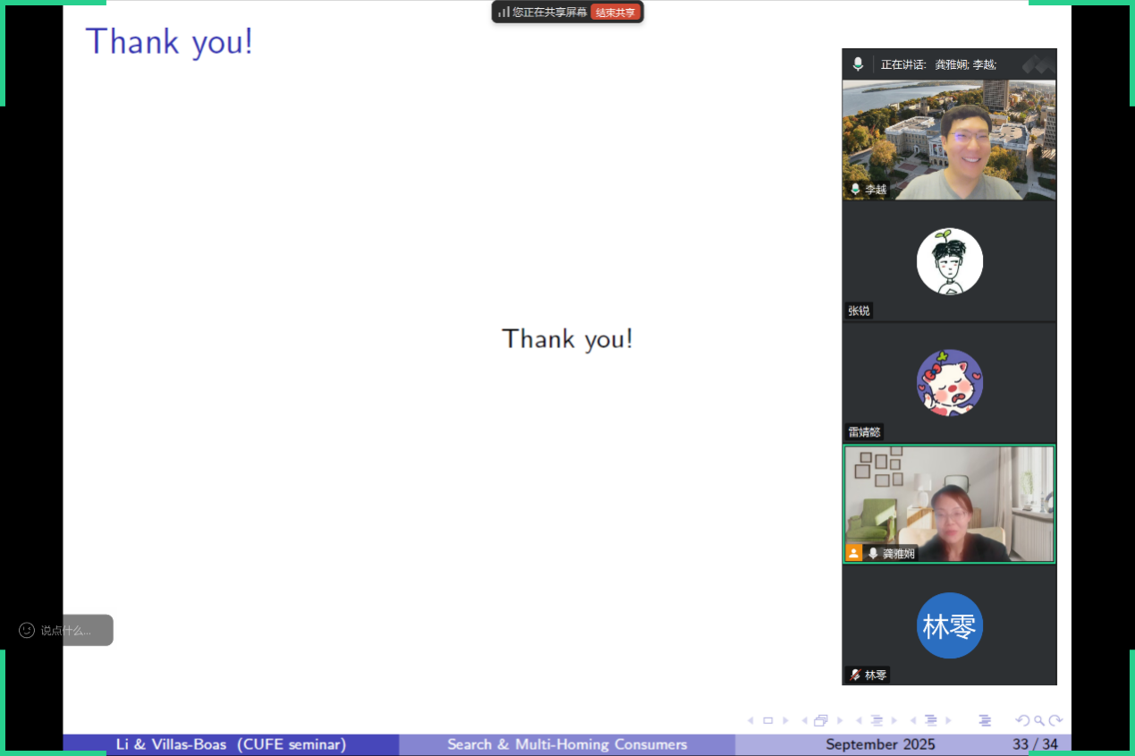 2025年9月24日周三下午,77779193永利“中青年学者讲座”在线上举行。此次讲座邀请山东大学77779193永利李越老师,分享题为“Sequential Search with Multi-Homing Consumers”的研究。77779193永利龚雅娴副教授主持讲座,77779193永利多位老师和三十余名学生参加了此次讲座。